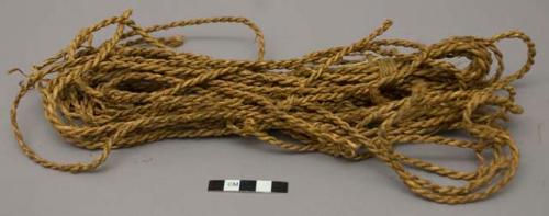 Cordas Cordão Acessar item no Acervo do museu de origemDocumentação Em “Termos de Uso”, disponíveis em (https://www.peabody.harvard.edu/node/778) explicita-se que o website é mantido pelo Peabody Museum of Archaeology and Ethnology, da Universidade de Harvard, que pode alterá-los a qualquer momento sem aviso prévio. O uso do website deve estar em concordância com: 1. O Site e grande parte do texto, imagens, gráficos, clipes de áudio e vídeo, informações e outros conteúdos do Site (coletivamente, o “Conteúdo”) são protegidos por direitos autorais, marcas registradas e outras leis. 2. O Conteúdo é disponibilizado somente para seu uso pessoal limitado, não comercial para fins educacionais ou acadêmicos, ou para outro uso justo na extensão permitida pela lei de direitos autorais dos Estados Unidos. A menos que especificado de outra forma no Site, você pode empregar as funções normais de seu navegador para baixar e imprimir uma única cópia de arquivos de Conteúdo individuais para tal uso, desde que você mantenha todos os direitos autorais e outros avisos de propriedade associados ao Conteúdo. Você deve citar o autor/artista e a fonte do Conteúdo como se fosse conteúdo de qualquer trabalho impresso, e a citação deve incluir a URL www.peabody.harvard.edu; 3. Concedem a permissão limitada acima sob os direitos autorais que possuem. Os direitos autorais e outros direitos sobre o Conteúdo também podem ser detidos por outros indivíduos ou entidades, incluindo artistas e outros detentores de direitos sobre as coleções do Museu Peabody reproduzidas no Site; 4. Usos Proibidos. É proibido copiar, exibir, publicar, distribuir, transmitir, modificar, executar ou utilizar ou explorar qualquer Conteúdo protegido no Site para qualquer propósito comercial ou com o propósito de torná-lo publicamente disponível. É proibido incluir qualquer Conteúdo protegido em um banco de dados, website ou recurso eletrônico, e de fazer qualquer outro uso do Conteúdo protegido que não seja expressamente permitido pela Seção 2; 5. Para solicitar permissão, sob direitos controlados por nós, para qualquer uso de outra forma proibido, favor entrar em contato com o Peabody Museum of Archaeology and Ethnology’s Office of Rights and ReproductionsPovo Indígena Karajá Autodenominação: Iny Iny Karaja Outros nomes para o povo: Carajás Localização: America do SulBrasilGoiás (GO)Mato Grosso (MT)Pará (PA)Tocantins (TO)Museu Peabody Museum (Cambridge, EUA) Localização: América do NorteCambridgeEstados Unidos Número de tombo: 18-12-30/F206 Número anterior: 18-12-30/F206Tipo de Acervo: EtnológicoCaracterísticas Dimensões: 33,5 x 10 x 4,3 cm 13 3,16 x 3 15,16 x 1 11,16 cm Quantidade de componentes: 1 Material/Suporte: FibraTesauro (FUNAI) Matérias Primas: Fibra VegetalProduto de origem VegetalProveniência Coleta: América do Sul, BrasilHistórico Cedente: Anônimo Coletor:Anônimo Forma de Aquisição: : Selecione Exportar ObraCordão