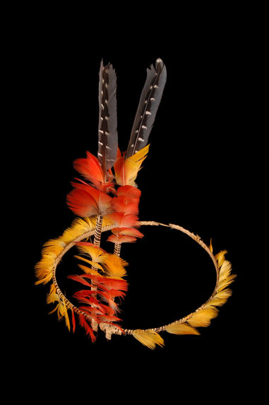 Penas vermelhas, amarelas e pretas com manchas brancas