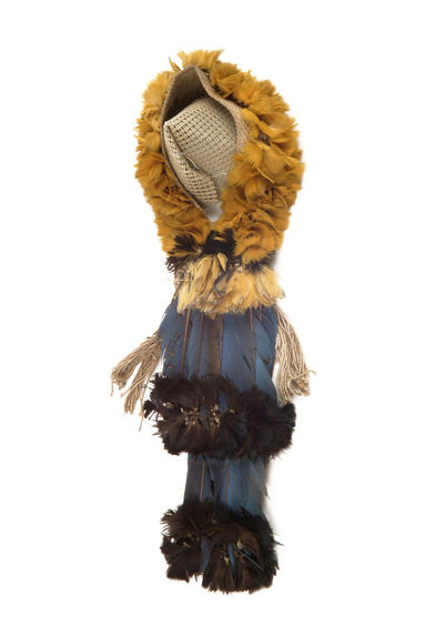Coroa de algodão e penas consiste de uma faixa de cabeça e uma cobertura de pescoço. A faixa de cabeça é feita de tecido grosso de algodão amarelado, que parece ter sido cortado em crochê. A cobertura do pescoço tem duas camadas de penas de cauda de ave com um lado externo azul e um lado interno amarelo. A camada externa é a mais curta. As penas de ambas as camadas terminam em pequenos tufos de penas pretas e suas hastes são escondidas por tufos de pequenas penas amarelas. Os canaviais aos quais os eixos das penas estão presos são escondidos por fios de algodão pendurados em ambas as extremidades da faixa de cabeça. Dimensões: comprimento da faixa de cabeça: 20 cm; largura de identificação. 5 cm; comprimento da camada interna da capa do pescoço: 28 cm; comprimento da camada externa id. 17 cm.