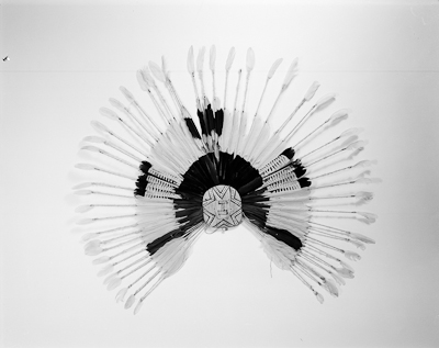 Faixa de penas em várias camadas, parte de um cocar. A base é uma faixa de fibra vegetal entrançada. A camada mais curta de penas é de penas pretas cortadas no centro, e azuis marrons nas laterais. Atrás deles estão varas de madeira finas e compridas com a próxima camada de penas fixadas a elas, que são principalmente rosa, com algumas outras com estampas pretas e brancas. As hastes são mais longas que as penas e suas partes superiores são envoltas em algodão. Nas pontas têm pequenas penas cor-de-rosa.