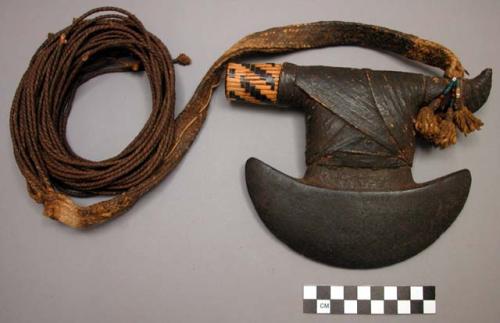 Machado Machado em forma de âncora – usado para esmagar o crânio do inimigo Acessar item no Acervo do museu de origemDocumentação Em “Termos de Uso”, disponíveis em (https://www.peabody.harvard.edu/node/778) explicita-se que o website é mantido pelo Peabody Museum of Archaeology and Ethnology, da Universidade de Harvard, que pode alterá-los a qualquer momento sem aviso prévio. O uso do website deve estar em concordância com: 1. O Site e grande parte do texto, imagens, gráficos, clipes de áudio e vídeo, informações e outros conteúdos do Site (coletivamente, o “Conteúdo”) são protegidos por direitos autorais, marcas registradas e outras leis. 2. O Conteúdo é disponibilizado somente para seu uso pessoal limitado, não comercial para fins educacionais ou acadêmicos, ou para outro uso justo na extensão permitida pela lei de direitos autorais dos Estados Unidos. A menos que especificado de outra forma no Site, você pode empregar as funções normais de seu navegador para baixar e imprimir uma única cópia de arquivos de Conteúdo individuais para tal uso, desde que você mantenha todos os direitos autorais e outros avisos de propriedade associados ao Conteúdo. Você deve citar o autor/artista e a fonte do Conteúdo como se fosse conteúdo de qualquer trabalho impresso, e a citação deve incluir a URL www.peabody.harvard.edu; 3. Concedem a permissão limitada acima sob os direitos autorais que possuem. Os direitos autorais e outros direitos sobre o Conteúdo também podem ser detidos por outros indivíduos ou entidades, incluindo artistas e outros detentores de direitos sobre as coleções do Museu Peabody reproduzidas no Site; 4. Usos Proibidos. É proibido copiar, exibir, publicar, distribuir, transmitir, modificar, executar ou utilizar ou explorar qualquer Conteúdo protegido no Site para qualquer propósito comercial ou com o propósito de torná-lo publicamente disponível. É proibido incluir qualquer Conteúdo protegido em um banco de dados, website ou recurso eletrônico, e de fazer qualquer outro uso do Conteúdo protegido que não seja expressamente permitido pela Seção 2; 5. Para solicitar permissão, sob direitos controlados por nós, para qualquer uso de outra forma proibido, favor entrar em contato com o Peabody Museum of Archaeology and Ethnology’s Office of Rights and ReproductionsPovo Indígena Apinajé Autodenominação: Apinayé Outros nomes para o povo: Apinagé Localização: BrasilTocantins (TO)Museu Peabody Museum (Cambridge, EUA) Localização: América do NorteCambridgeEstados Unidos Número de tombo: 48-14-30/5644 Número anterior: 48-14-30/5644Tipo de Acervo: EtnológicoCaracterísticas Dimensões: 15,3 x 20 x 3,9 cm 6 x 7 7,8 x 1 9,16 cm Quantidade de componentes: 2 Material/Suporte: Lítico, fibra, madeira, resina, algodão, vidroTesauro (FUNAI) Artefatos: Equipamento agrícolaEquipamento para trabalhoMachado Matérias Primas: Fibra VegetalMadeiraPedraProduto de origem MineralProduto de origem VegetalProduto industrializadoProveniência Coleta: América do Sul, BrasilHistórico Cedente: Mr William C Downs Coletor:Mr William C Downs Forma de Aquisição: : Selecione Exportar ObraMachado em forma de âncora – usado para esmagar o crânio do inimigo