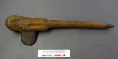 Machado de pedra acoplado a cabo de bastão de madeira esculpido em uma ponta na extremidade, usado para dividir árvores macias e podres para a medula e vermes.