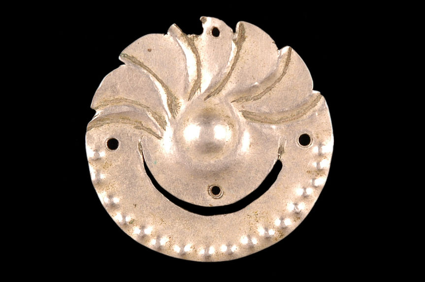 Função: Pingente de colar feminino. Feito por homens com moedas de "diniélo" (corrupção do "dinheiro" português) marteladas no plano do machado e empurradas para trás com pregos.