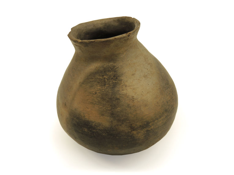 Fundo arredondado sem pé marcado. Pescoço maior e pasta cinza. As marcas negras encontradas em várias peças são marcas de fogo.