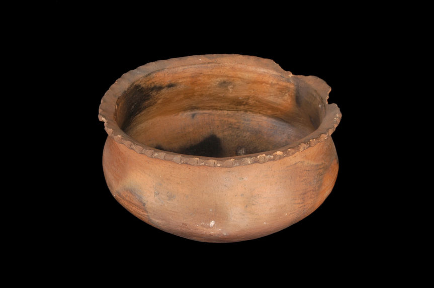 A)Corpo carenado, pé chato, base plana, pescoço baixo largo com achatamento horizontal. Superfícies bem alisadas. Incisões na borda do plano. Um grande chip no fundo permite ver o interior.