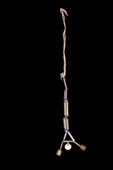 Função: Usado para segurar grandes chapéus de palha de fabricação nativa. As peças de metal são feitas por homens, bordado de miçangas por mulheres. Usado por ambos os sexos.