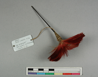 Um de um par de brincos com penas vermelhas em torno de um disco de concha Um de um par de brincos com penas vermelhas em torno de um disco de concha, todos presos a varas finas. Acessar item no Acervo do museu de origemDocumentação Coleções Online – Termos e Condições Você pode usar o conteúdo do site de coleções online do Pitt Rivers Museum sujeito aos Termos e Condições estabelecidos nesta página. O acesso e utilização deste site constitui a aceitação por você dos Termos e Condições em vigor no momento da utilização.O Pitt Rivers Museum faz parte da Universidade de Oxford e reserva os direitos autorais de todo o material, salvo indicação explícita em contrário. Quando um terceiro detém direitos de propriedade intelectual sobre uma imagem, isso foi indicado. O Museu envidou todos os esforços razoáveis para garantir que todo o conteúdo reproduzido neste site seja devidamente licenciado pelos proprietários dos direitos autorais.As coleções on-line do Museu Pitt Rivers foram criadas principalmente para uso por pesquisadores e também por membros da comunidade em todo o mundo. As imagens e o material deste site podem ser usados para fins educacionais e comunitários não comerciais, incluindo escolas, estudantes de ensino superior e de ensino superior e funcionários para usos relacionados à educação.Entre em contato com nosso departamento de Serviços Fotográficos se desejar reproduzir quaisquer imagens deste site para quaisquer outros usos não descritos acima, ou se tiver alguma dúvida relacionada ao uso de imagens neste site, incluindo orientações adicionais sobre o que constitui um produto não comercial. ou uso educacional. As imagens e materiais deste site não podem ser utilizados livremente ou sem permissão para fins comerciais. Os termos e condições também se aplicam.Se um objeto ou obra em nossas coleções estiver protegido por direitos autorais do artista, uma permissão adicional do artista, do espólio ou de seu representante deverá ser obtida antes que a imagem possa ser usada. O Pitt Rivers Museum não pode garantir permissões adicionais em nome de um cliente. Entre em contato com o detentor dos direitos autorais relevante para obter informações de uso específicas.Todos os usos devem ser acompanhados de créditos apropriados e declarações de direitos autorais. Todas as imagens de nossas coleções, galerias e edifícios são “© Pitt Rivers Museum, University of Oxford”, salvo indicação em contrário. A atribuição deverá incluir também o número de acesso do objeto.Os usuários devem concordar que não hackearão ou interferirão no conteúdo mantido pelo site Coleções Online do Museu Pitt Rivers, nem encorajarão ninguém a fazê-lo.É concedida permissão para vincular diretamente às páginas hospedadas neste site. O Pitt Rivers Museum não é responsável pelo conteúdo ou pela confiabilidade de qualquer site ao qual esteja vinculado e não endossa necessariamente as opiniões expressas neles. Links para ou provenientes deste site não devem ser considerados como endosso de qualquer tipo.Embora sejam feitos todos os esforços para garantir a exatidão do material incluído neste site, ele é disponibilizado apenas para informação geral e não constitui aconselhamento profissional ou jurídico.O Pitt Rivers Museum não será responsável por qualquer perda ou dano relacionado direta ou indiretamente ao uso deste site. Povo Indígena Kayapó Autodenominação: Mebengôkre Outros nomes para o povo: Txukarramãe Kayapó-Irã'ãmranh-re Localização: America do SulBrasilMato Grosso (MT)Pará (PA)Museu Pitt Rivers Museum (Oxford, Inglaterra) Localização: EuropaInglaterraOxford Número de tombo: 1979.1.2Tipo de Acervo: EtnológicoCaracterísticas Dimensões: 75 mmx 120 mm Quantidade de componentes: 1 Técnicas: Amarrado Material/Suporte: Pena, madeira, concha Função: AdornoTesauro (FUNAI) Artefatos: Adorno corporalAdorno para cabeçaBrinco Matérias Primas: ConchaMadeiraPenaProduto de origem AnimalProduto de origem MineralProduto de origem VegetalProveniência Coleta: Brasil, Tocantins Data Produção: Antes de 1979Histórico Cedente: Antonio Pereira Neto, Celina da Silva Gross Coletor:Antonio Pereira Neto Forma de Aquisição: doacao Data de Aquisição: 1979 Exportar ObraUm de um par de brincos com penas vermelhas em torno de um disco de concha, todos presos a varas finas.