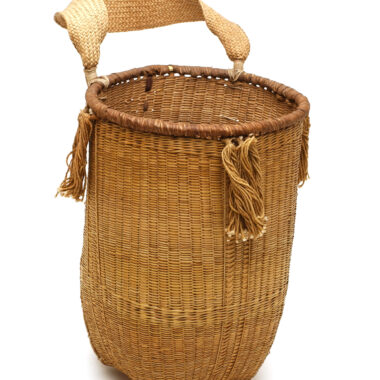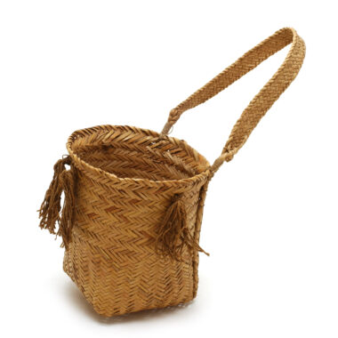 Capuz: cesto munido de uma alça ou faixa de transporte em fibra de casca de árvore de aprox., E trançado em fibras de cipó liana. Trançado a céu aberto e fornecido com uma alça ou faixa de transporte em fibra de casca de árvore de aprox. Utensílio feito por homens e utilizado por ambos os …