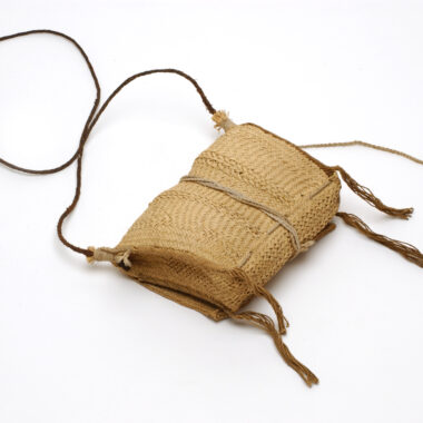 Saco em forma de caixa retangular, feito de fios de folhas de palmeira entrançados.