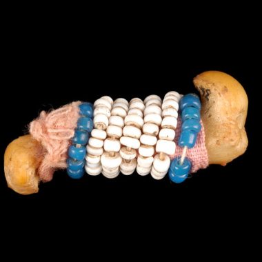 Bastão constituído por um cabo de junco de 17 cm de altura; uma armação de junco de 2 cm de diâmetro e 25,5 cm de altura coberta com penas entrelaçadas na armação e com as hastes fixadas com fio de algodão. A primeira fileira de penas, de 1 cm de altura, consiste de penas pretas …