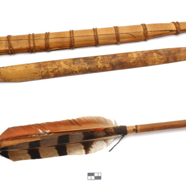 Ponta lanceolada de bambu montada em mastro de junco. Arrow equipado com uma bainha de folha dobrada.